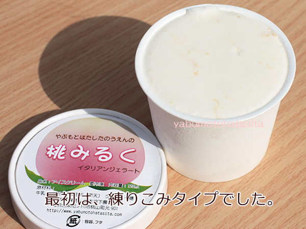 桃の果肉に水分が多いため、みるくジェラートはなめらかでやわらかいけど、桃の果肉はだんだんと 氷のようにカチカチになりましたこれでは 美味しさも半減です。